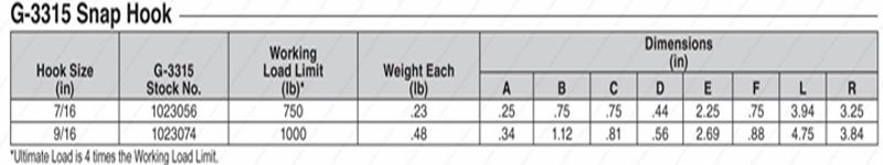 G-3315 Snap Hook,Product weight: .23 – .48 lb,Hook Body — Galvanized ,Pressed steel latches and stainless steel springs, bolts and nuts.