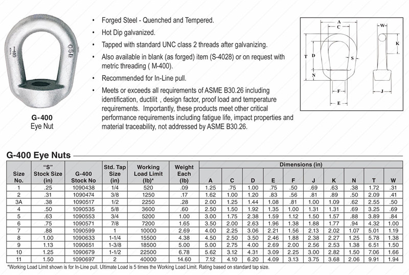 G-400 Eye Nuts are made of high quality drop forged steel and meet or exceed all requirements of ASME B3026, including identification, ductility, design factor, proof load and temperature requirements. Loads are based on a safety factor of 5 to 1.