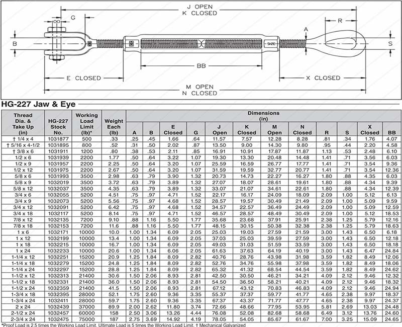 HG-227 Jaw and Eye Turnbuckle, Hot Dip Galvanized Steel, WLL: 500-75,000lb, Weight: .33-187lb, Engineered for Rapid Connection & High-Strength Load Transfer