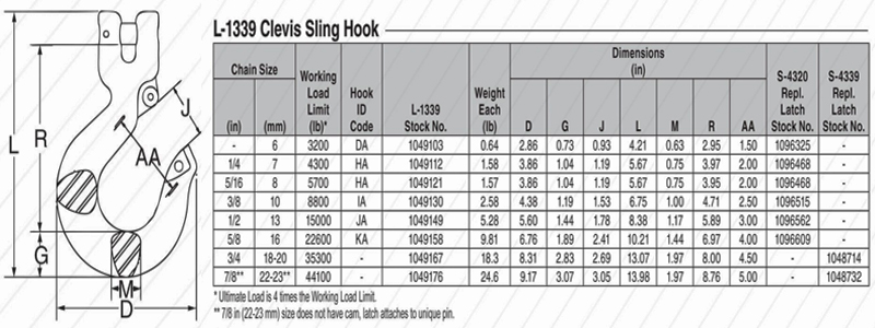 L-1339 Clevis Sling Hook, Quenched & Tempered Alloy Steel, Weight: 0.64-24.6lb, Rated for 2.5 times working load limit with certification, Approved for Grade 80 and 100 chain use.