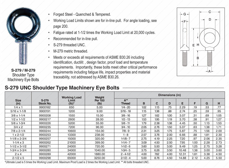 S-279 UNC 2600lbs Shoulder Type Machinery Eye Bolts,Forged steel,Precision-Engineered Shoulder Design and Axial Load Stability for Heavy-Duty Rigging in Marine and Industrial Applications