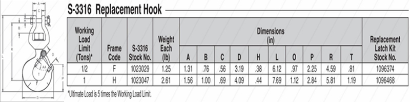 S-3316 Replacement Hook, Weight: 1.25-2.61 lb, 1/2lb-1lb Load, Swivel jaw is forged.